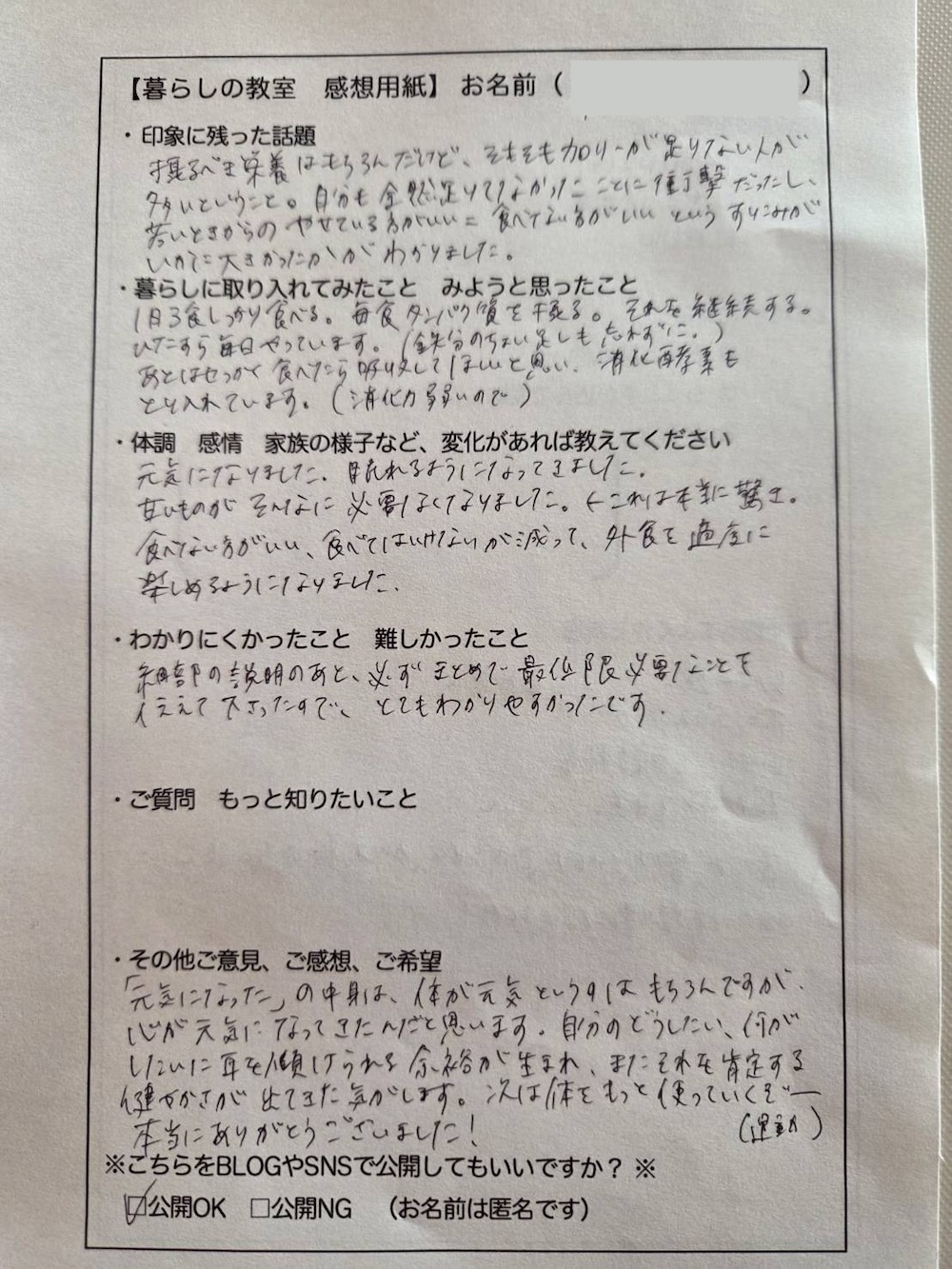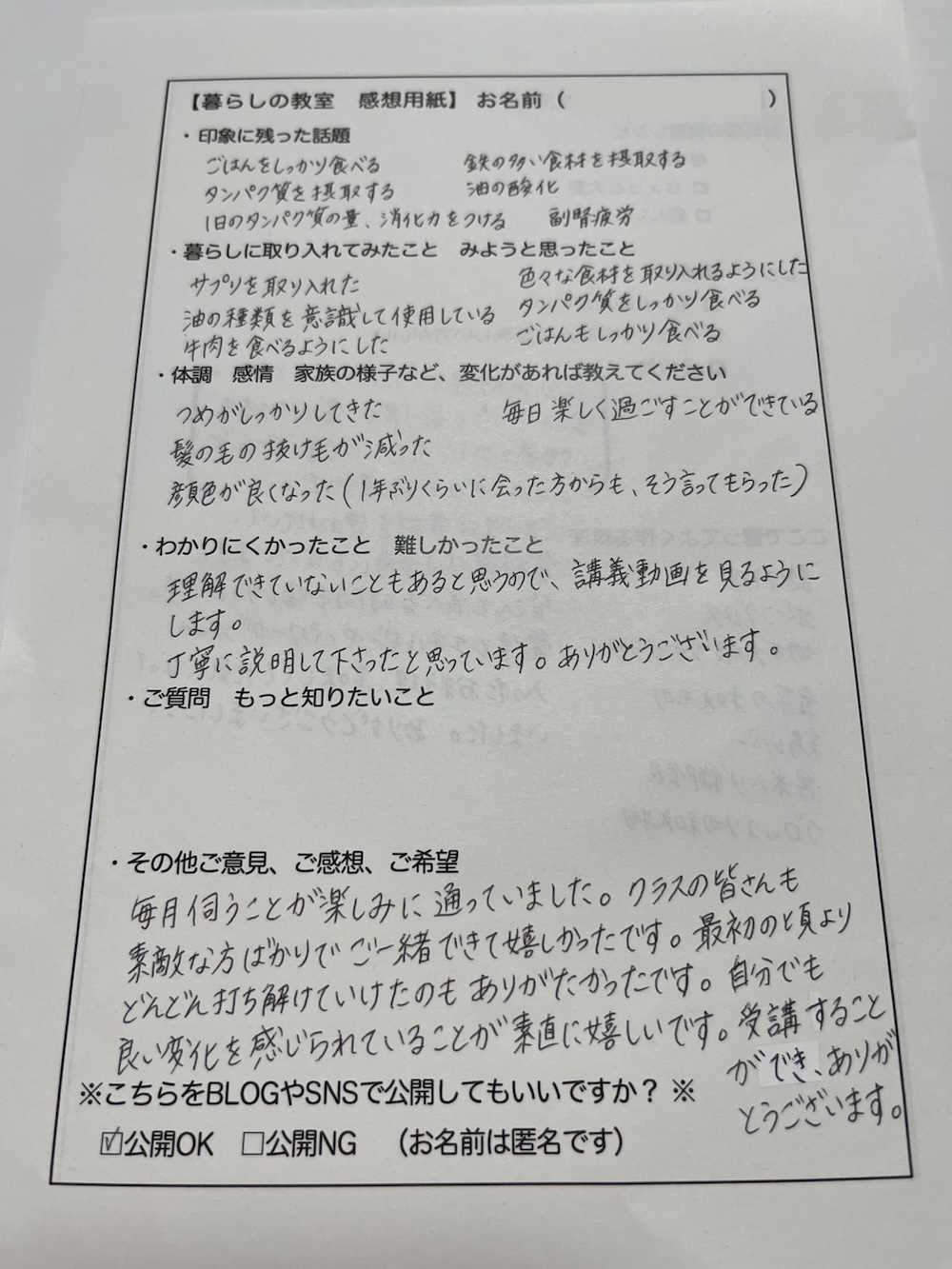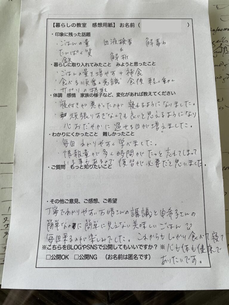 自分だけでなく、夫や子どもの変化を報告してくださった方が何人もいました。学んだことを家庭の食事に取り入れた結果、家族の体調や行動に変化が出た、という内容です。